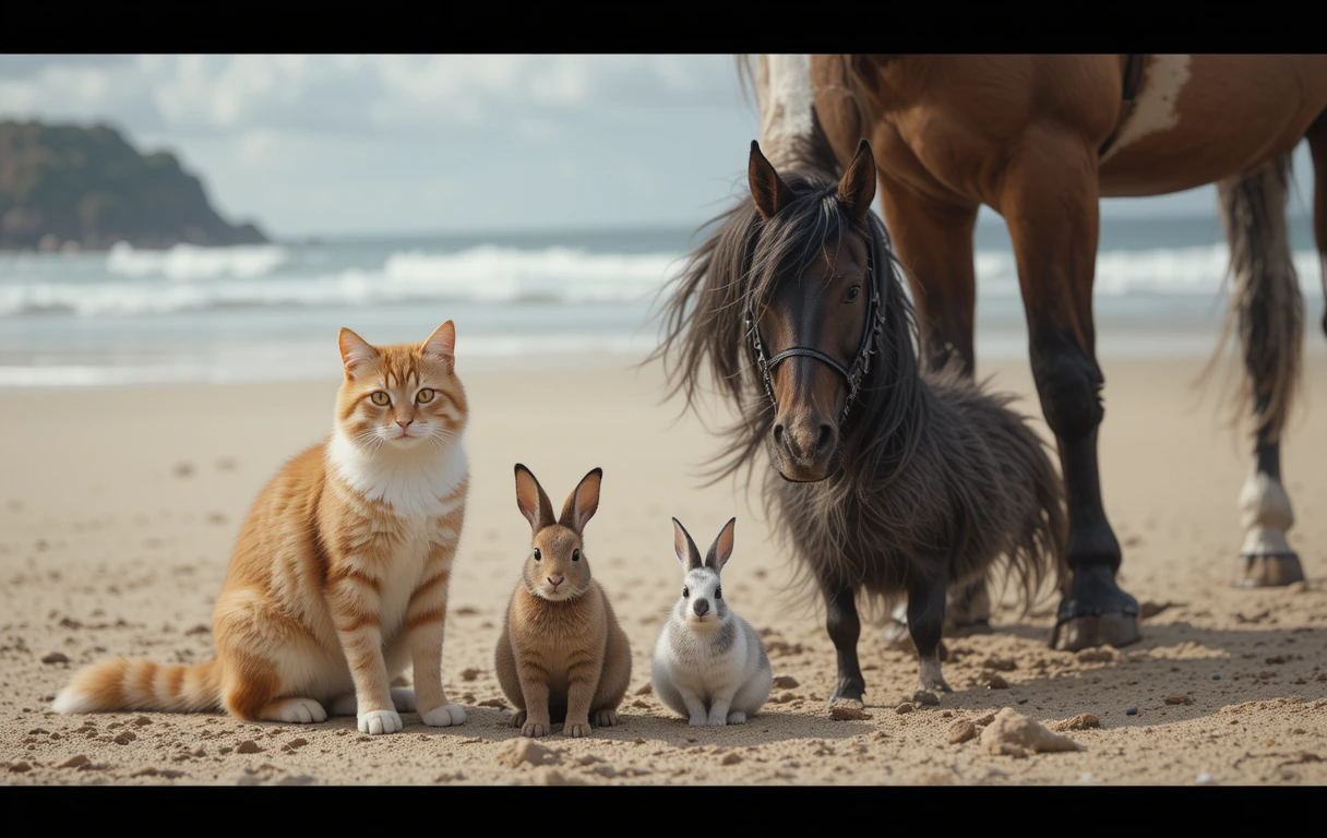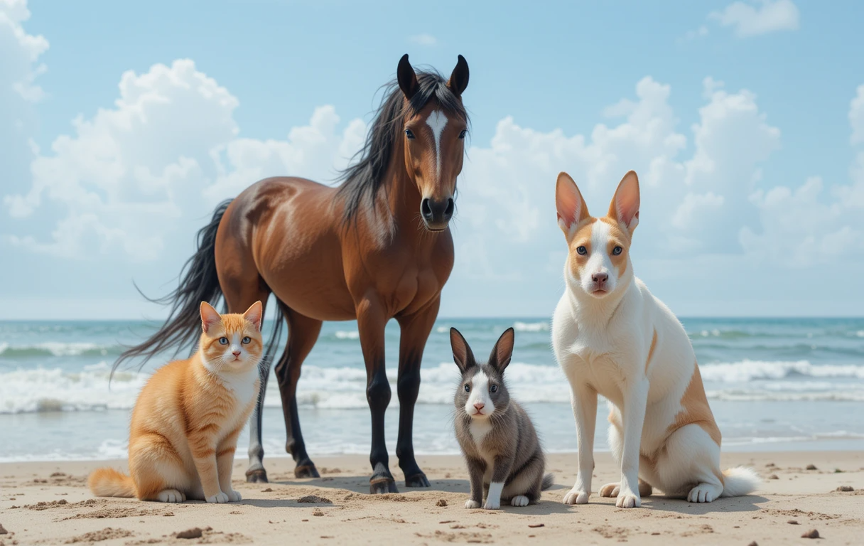 프롬프트:A photo of a dog, cat, rabbit and horse at the beach