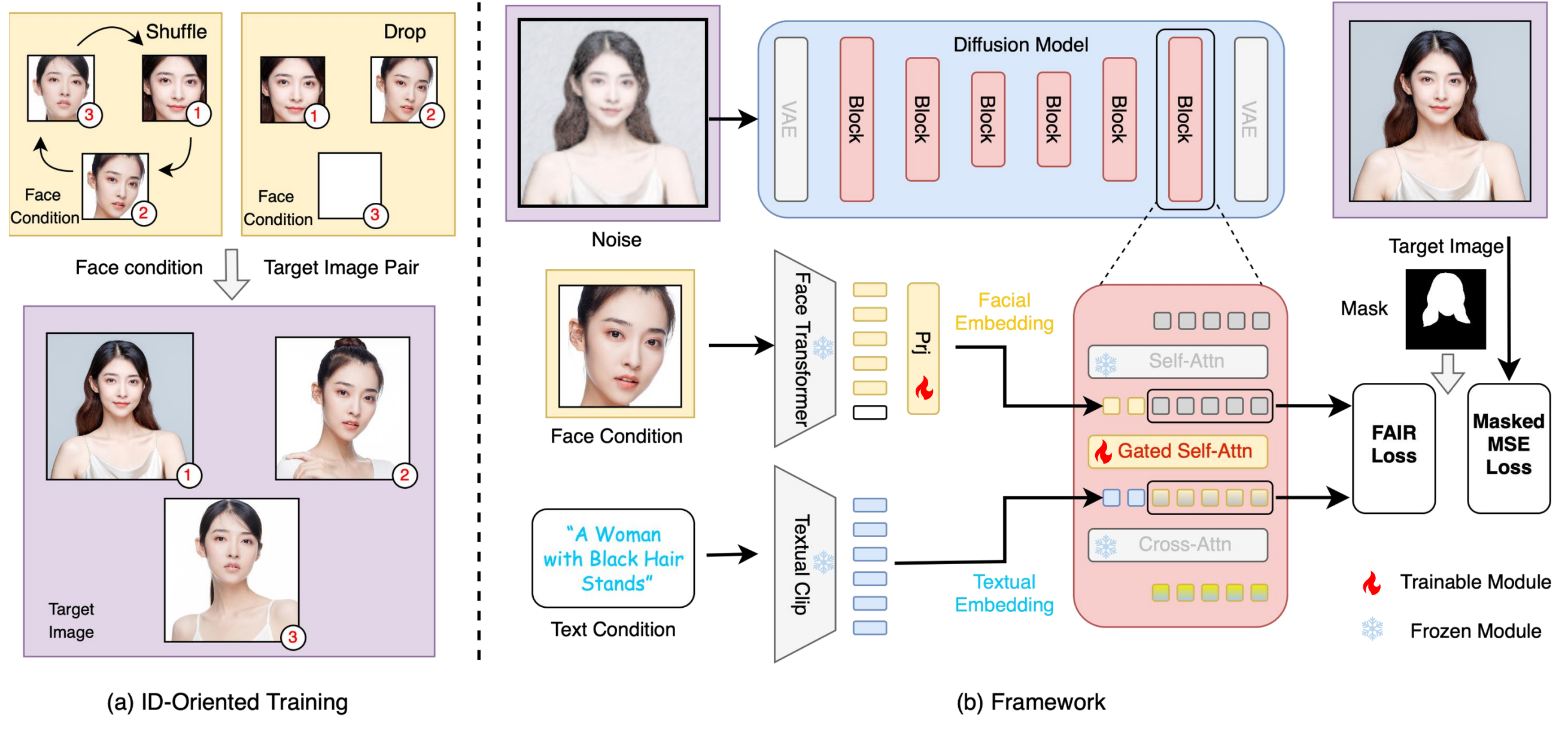 기존에도 ip-adapter 또는 photomaker, instantID 같이 얼굴 이미지를 활용해 원하는 이미지를 그려내는 연구는 많이 있었다. 하지만, 저자들은 이들 연구들이 입력 이미지를 결과 이미지에 어떻게 합성하는지에 대해서만 고민했기 때문에 원본 이미지의 머리방향, 스타일, 포즈 같은 다른 property들이 decouple 되지 않았다고 한다. 이에 저자들은 이를 decouple하는데 초점을 맞춘 FACT 아키텍처를 제안한다.
