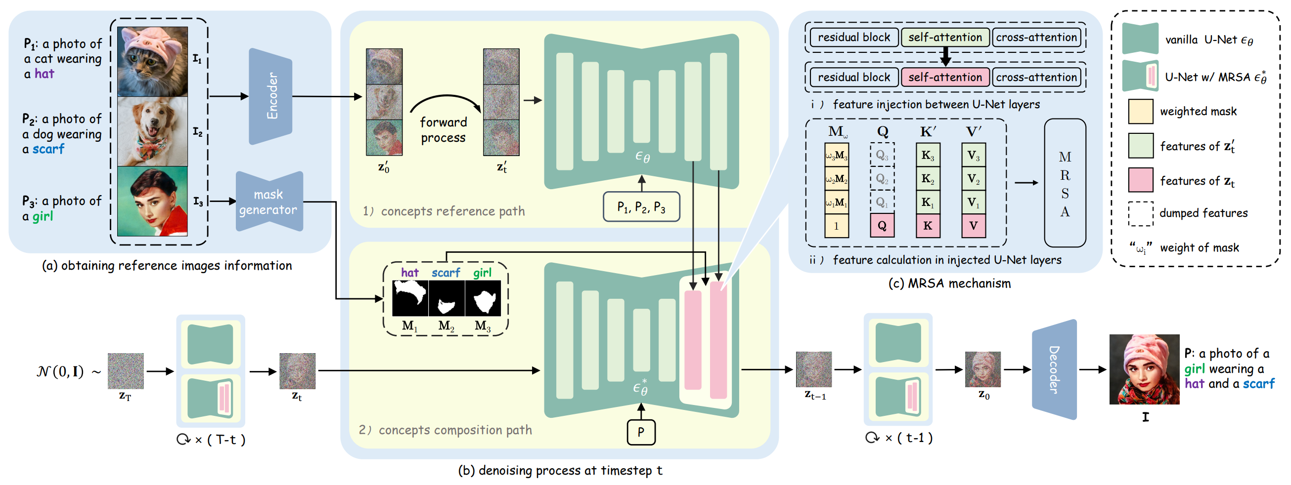 Composition path에서는 unet의 self attention 모듈을 MRSA로 바꾼뒤, timestep과 unet layer마다의 Q, K, V 값을 계산한다. 이 때, self-attention 모듈의 feature가 denoising 과정에서 inject되는데, 그로 인해 MRSA는 레퍼런스 이미지들의 feature에 대한 정보를 가지게 된다.