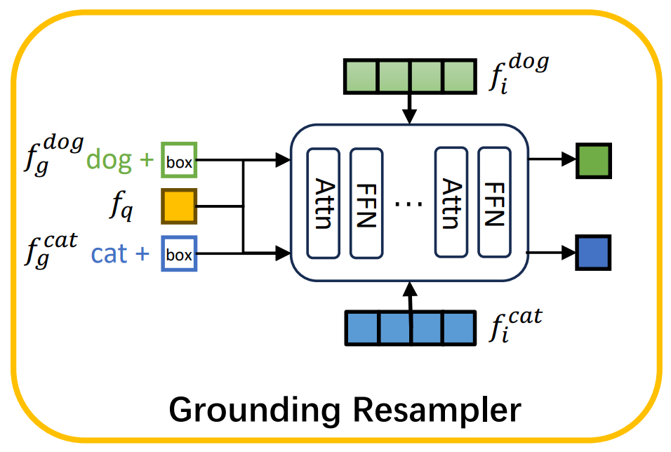 Grounding resampler는 이미지의 feature를 추출하기보다, 해당 concept의 영역을 어텐션을 이용해 새로운 embedding으로 mapping하는 projection의 역할을 한다.