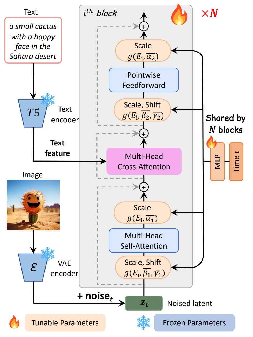 또한, 효과적인 모델 학습을 위해, DiT 전체 파라미터의 약 27%를 차지하는 AdaLN 모듈을 줄이기 위해 모든 block에서 동일한 값을 사용하는 AdaLN-single 아키텍처를 제안한다.