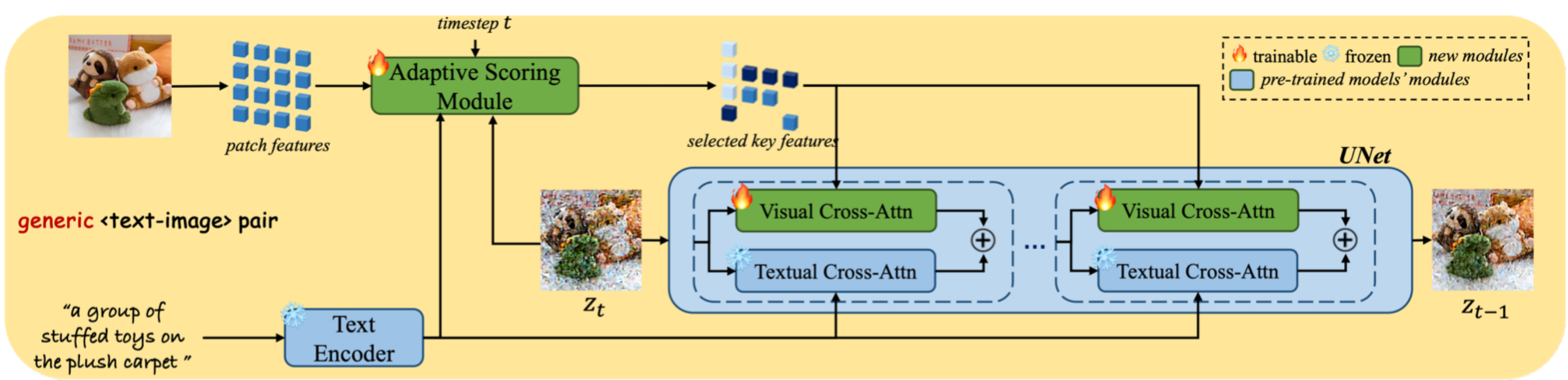 Pseudo-token에 해당하는 concept은 일치하면서도 배경이나 포즈, 스타일 등은 달라져야 하는데, pseudo-token을 사용해 학습하면 해당 토큰과 프롬프트의 다른 부분들이 이미지에 동시에 영향을 미치기 때문에 이를 분리해줘야 한다고 생각했고, 그래서 저자들은 학습하는 동안에는 레퍼런스 이미지의 generalized visual feature와 텍스트 프롬프트 사이의 alignment를 학습하도록 도와주는 adaptive scoring module을 제안한다. 또한, inference 때에는 adaptive mask guidance strategy를 이용해 앞에서 학습한 alignment를 좁혀가는 방법으로 이미지를 생성한다.