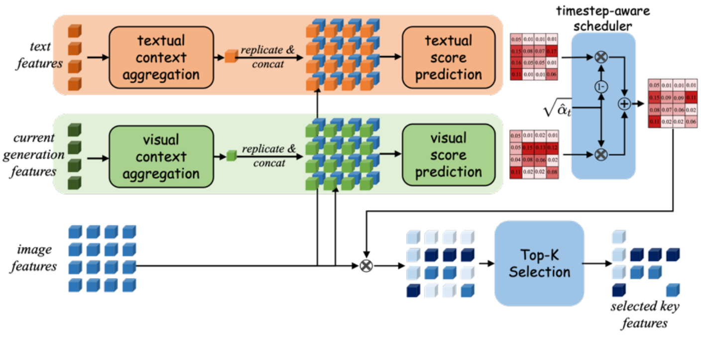 그래서 저자들은 visual feature를 그대로 넣기보다 adaptive scoring module에서 image feature에 generated feature와 text feature를 각각 결합해 각각의 score를 고려해 feature를 뽑는 방법을 제안했다.