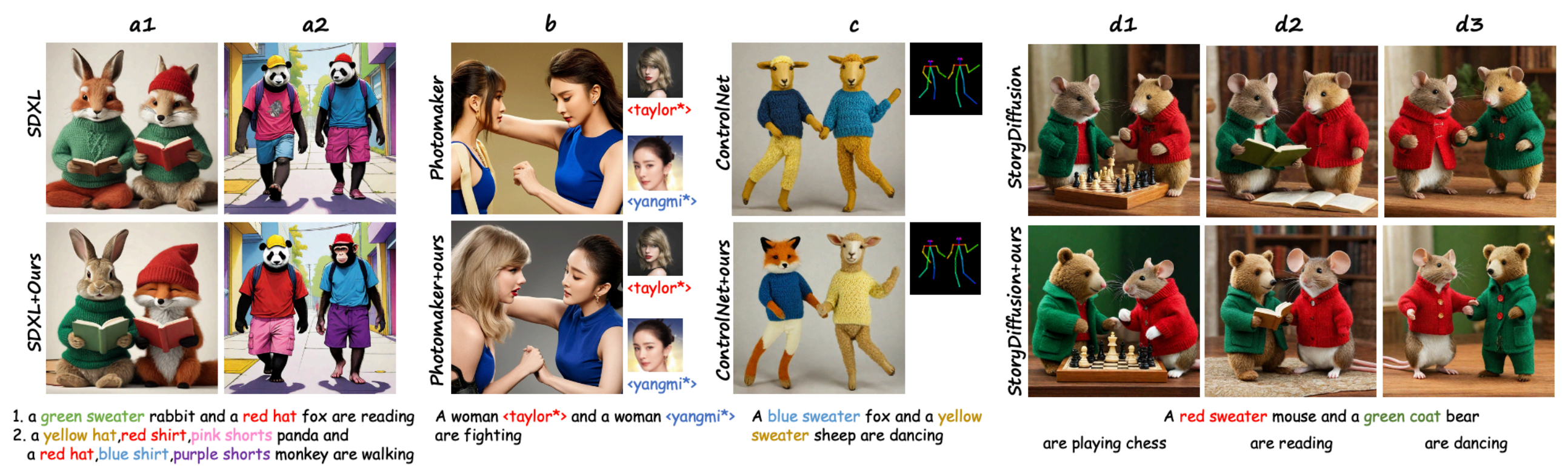 기존의 foundation 모델들은 multi object를 생성하는데 어려움을 겪고 있다. 예를 들어, 아래 그림에서 보듯, "초록색 옷을 입고 있는 토끼와 빨간 모자를 쓴 여우"를 그리라고 하면, 토끼만 두 마리를 그리거나 둘 다 초록색 옷을 입고 있는 이미지를 그려준다.