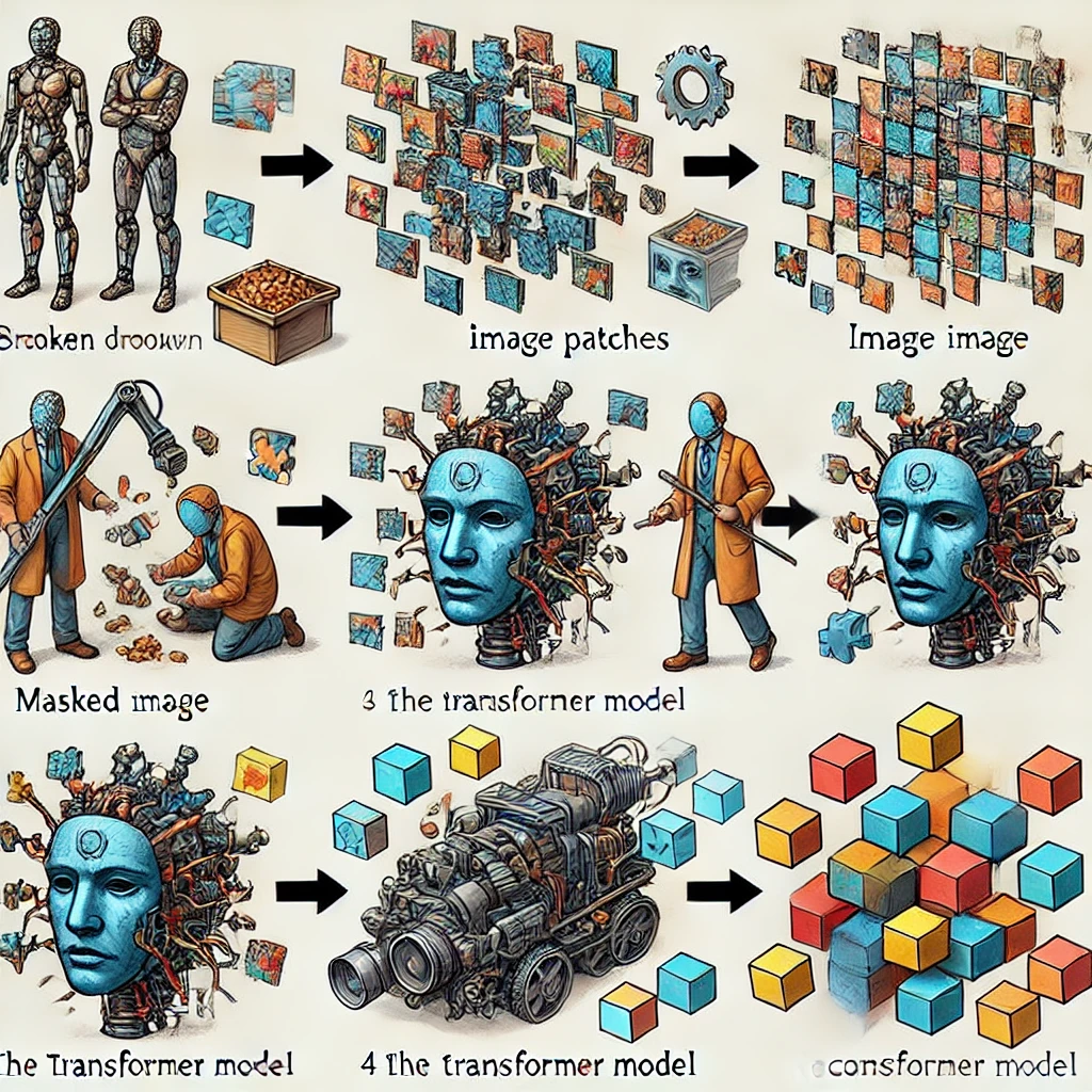 - 학습: 모델은 마스킹된 부분을 예측하면서 학습합니다. 이를 통해 이미지의 전체적인 구조와 세부 사항을 모두 학습할 수 있습니다.